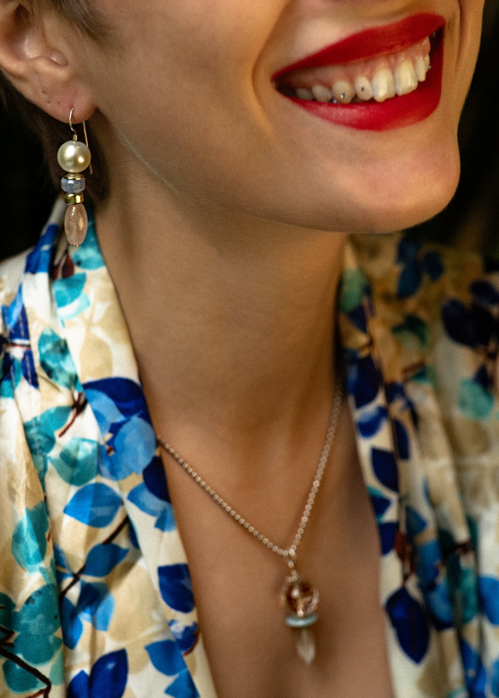 Crafted with authentic Pearls, Chalcedony, and rose quartz, these earrings bring a charming twist to your look. A dazzling duo that adds a fun and stylish spark to any outfit.