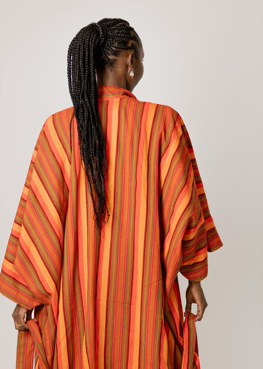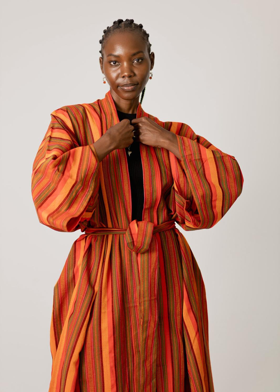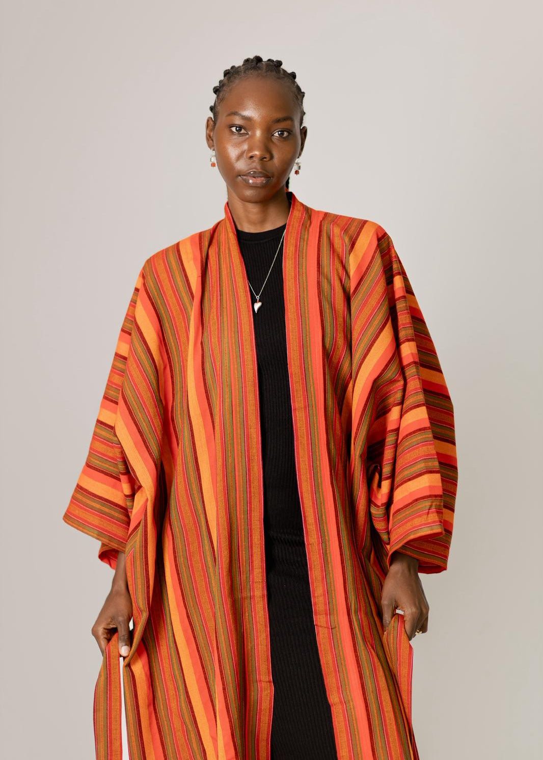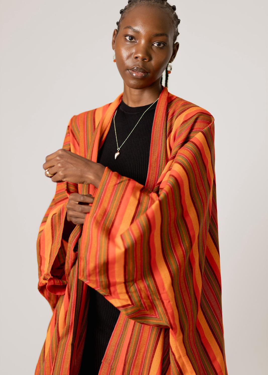 Wrap yourself in effortless style with this vibrant striped kimono, crafted from premium heavy cotton for a luxurious yet breathable feel. Designed to drape beautifully, this piece features bold orange, red and olive-toned stripes that add warmth and character to any outfit.