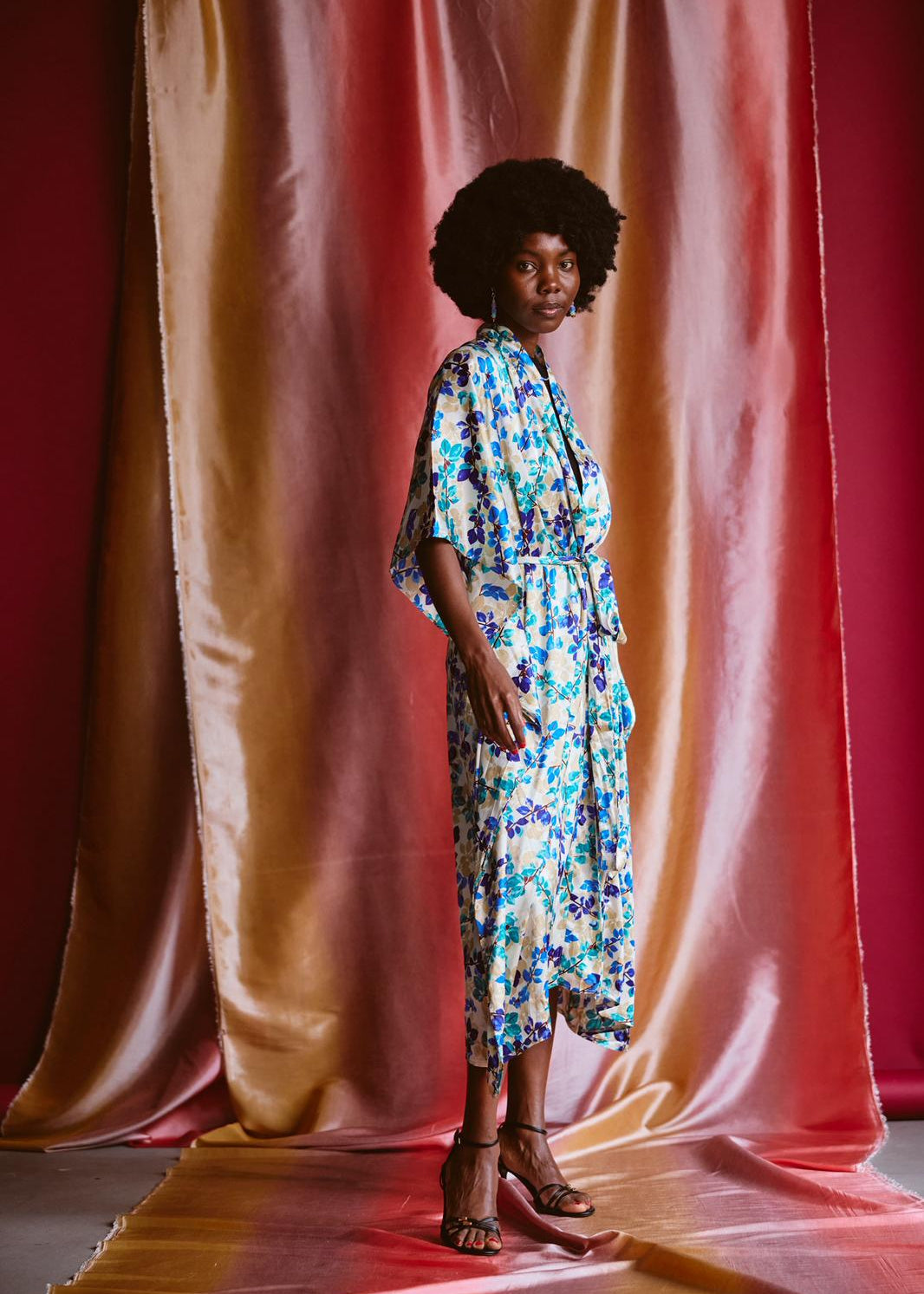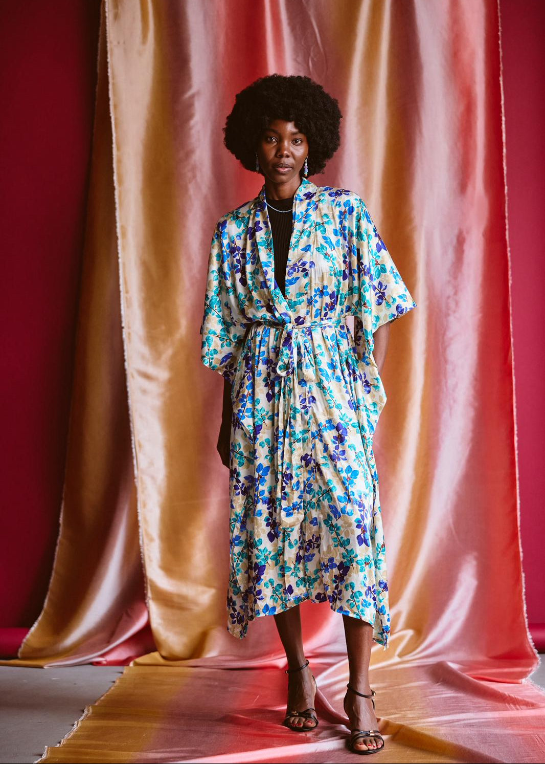 Infuse your wardrobe with the cool tranquility of the Oceana Silk Kimono. Designed with a soft ivory base and vivid blue floral motifs, this kimono captures the essence of calm seas and breezy elegance. The silky fabric flows beautifully, enhanced by a relaxed cut and a self-tie belt that defines the waist with ease.