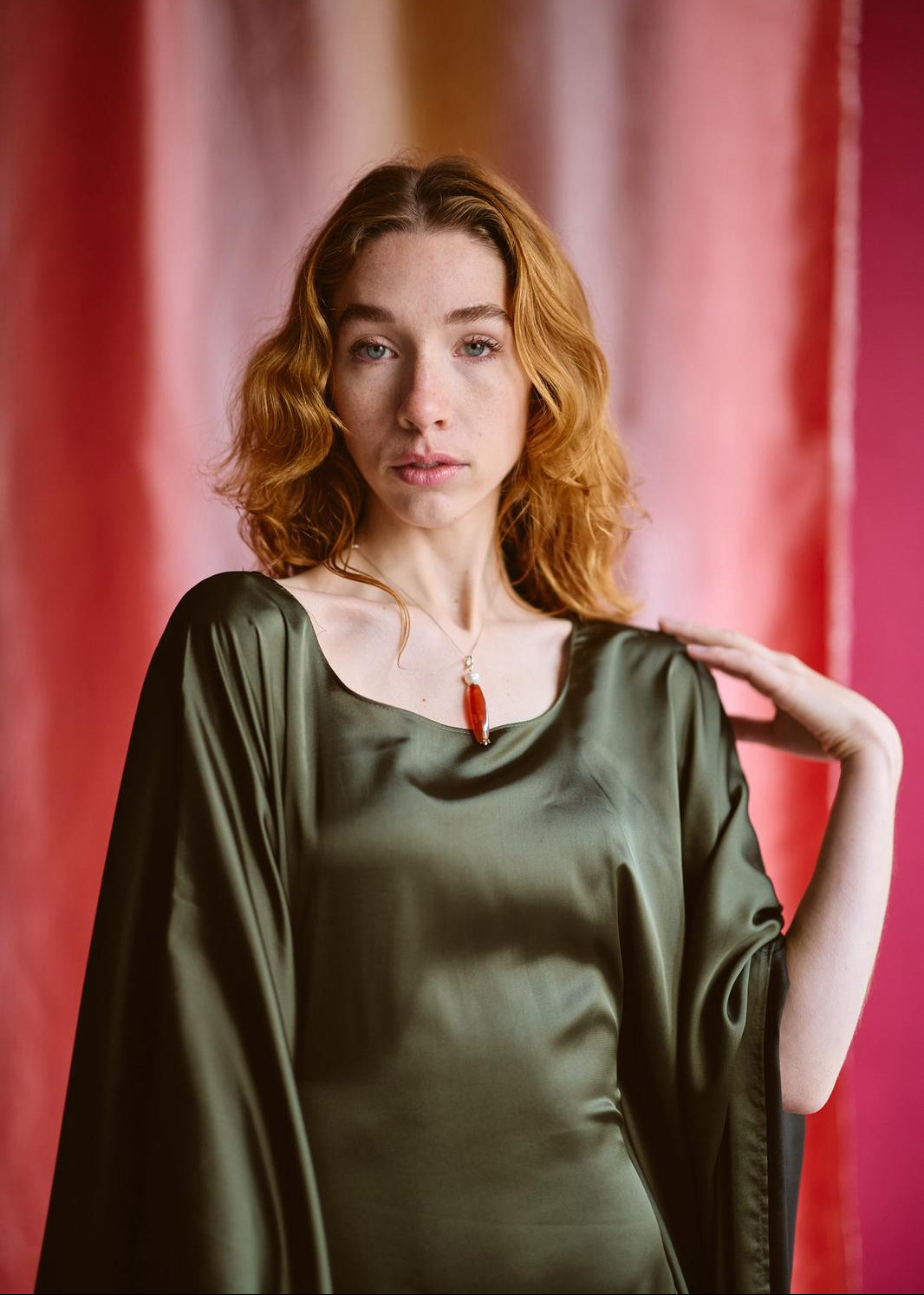 This dress embodies olive green's rich, earthy tones, creating a serene and sophisticated look. This elegant piece exudes a sense of calm and nature, offering a soft yet striking presence. The deep olive green base is perfect for those who appreciate subtlety with a touch of refinement.